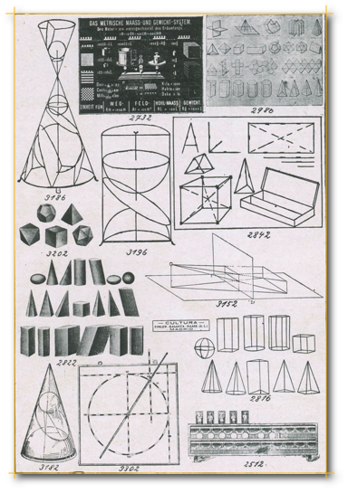 Cuerpos y útiles Geométricos La casa Cultura de Madrid ofrecía, además de los cuerpos en madera y metal, colecciones en cartulina de 20 hojas y 33 figuras con los desarrollos de los principales modelos geométricos.