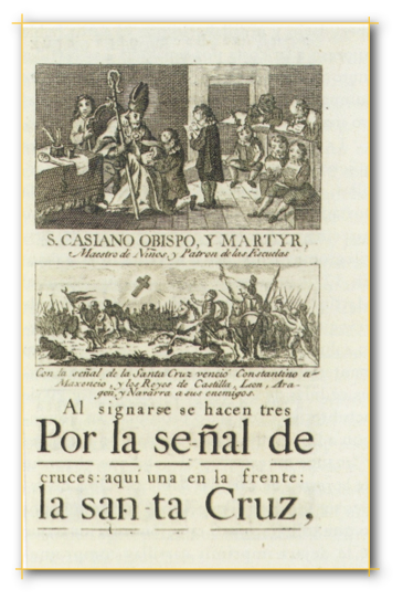 Portada y página primera del Catón escrito por Joaquín Moles en 1772. Nótese la belleza de los grabados y la pulcritud de la grafía. Silabarios y Catones