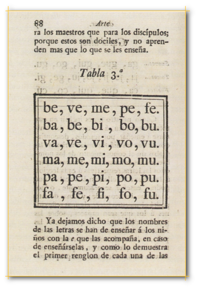 Páginas del Nuevo catón de José Mariano Vallejo, profesor del Seminario de Nobles y alumno del Real Instituto Militar Pestalozziano, obra de la que se hicieron varias ediciones desde la primera mitad del siglo XIX. Silabarios y Catones
