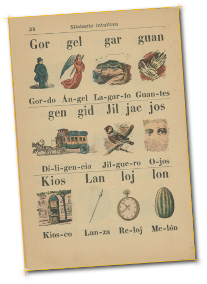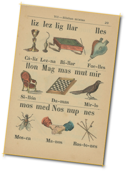 Dos muestras del conocido Silabario intuitivo de Esteban Paluzíe, aprobado para texto en 1879. Silabarios y Catones