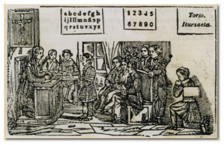 En el muro aparecen colgados los elementos del currículum tradicional: el alfabeto (para leer), el numerario (para contar), los nombres de los calígrafos Torío e Iturzaeta (para escribir) y la cruz (para rezar).