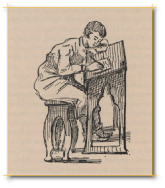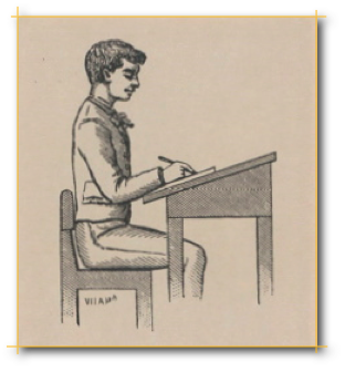 Mesas para escritura Posición "viciosa" y correcta que debe adoptar el niño al escribir según Compendio de Antropología y Pedagogía de Pedro Muñoz Díaz, publicado en 1911.