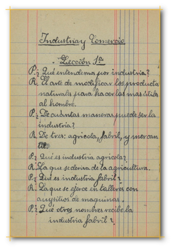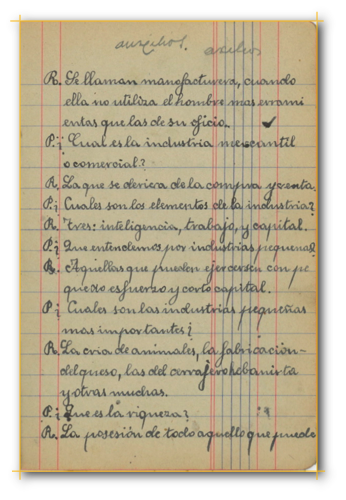 Escrituras ordinarias Páginas de cuaderno manuscrito de 1920 que muestran el copiado de lecciones a partir de un manual, una práctica habitual en la escuela tradicional.