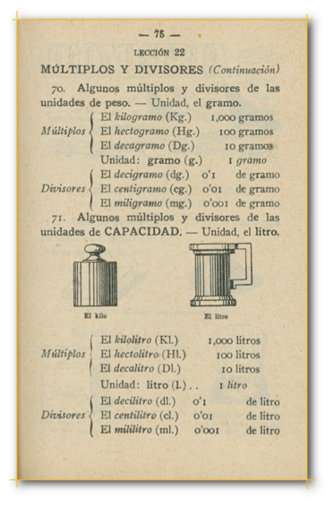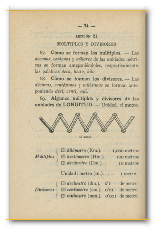 Tratamiento en texto de la formación de múltiplos y divisores siguiendo el sistema decimal. De la Enciclopedia Dalmáu (Grado Preparatorio). Edición de 1967. Sistema Métrico Decimal