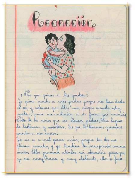 Colección de plumas y escritorios con diversos elementos para la práctica escribana. De la pizarra se pasó al uso generalizado de los cuadernos con rayado doble o simple y con fondo de cuadrícula sobre el que se aplicaba el lápiz grafito, las pinturas o la pluma mojada en tinta de diversos colores, fabricada a menudo en la misma escuela.