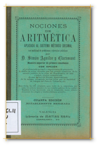 Nociones de Aritmética aplicada al Sistema Métrico Decimal de Simón Aguilar y Claramunt, libro editado por Matías Real en 1904.