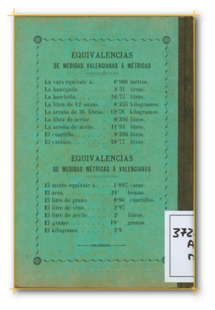 En la contracubierta se ofrecen las equivalencias entre las medidas métricas y las que se usaban en Valencia. Sistema Métrico Decimal