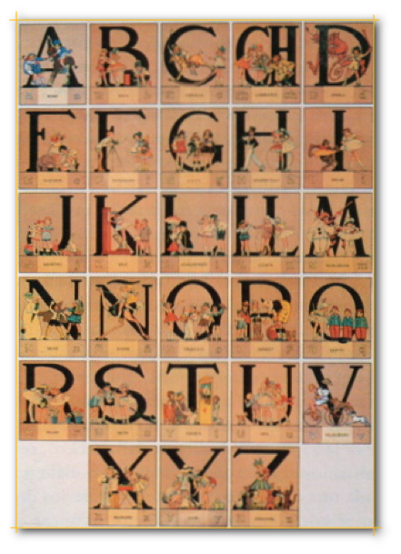 Abecedario iconográfico en forma de cartel diseñado por el conocido	grafista barcelonés Ricardo Opisso (c. 1915).  Presenta también letras recortables para componer palabras. Abecedarios  Iconográficos